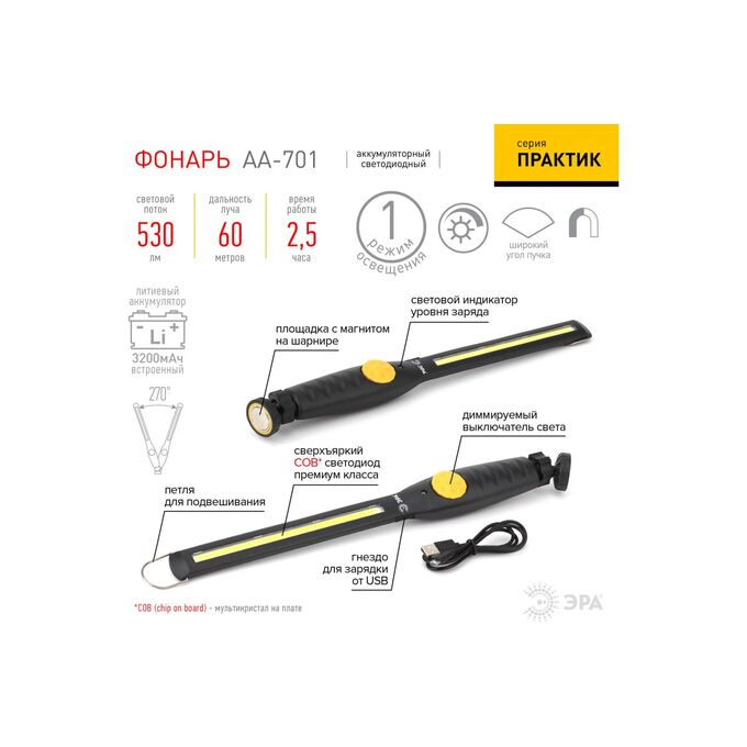 Технические характеристики ЭРА Практик AA-701 7,3Вт COB, 3,2Ач литий, крюк, магнит, изгиб корпус Б0036613