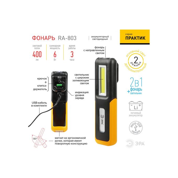 Дополнительные технические характеристики светодиодного фонаря ЭРА Рабочие, серия "Практик" RA-803 аккумуляторный, крючок, магнит Б0052313: