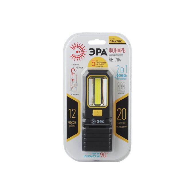 Кемпинговый светодиодный фонарь ЭРА RB-704 Практик 5Вт COB 3xLED 3xAAA крючок 2 магнита Б0029179 - многофункциональный светодиодный фонарь с режимом светильника и двумя типами крепления. Корпус сгибается в двух направлениях (по 90 градусов каждое). На торце - мощный магнит. Дополнительный магнит расположен на задней стороне фонаря. Имеется удобный прочный крючок. Закрепив фонарь на нужной поверхности, можно быстро настроить необходимый для работы угол освещения. Переключение режима превращает фонарь в светильник с ближним заливающим светом. Фонарь незаменим как при профессиональных работах (строительство, ремонт, монтаж, обслуживание), так и в частном использовании (работы в доме, на приусадебном участке, путешествия). Покрытие корпуса - софт-тач (мягкое, приятное на ощупь, без скольжения). Основной режим освещения - яркая LED-плата СОВ (5 Вт). Сопутствующий - 3 диода на торце с направленным лучом длиной до 20 метров. Сверхмощные светодиоды COB ("chip on board" - "кристалл на плате") ранее применяли исключительно в промышленном освещении, сейчас технологию удалось адаптировать под универсальные цели. Получился яркий и при этом мягкий ровный свет. Одного комплекта батареек (3 мизинчиковые) хватит на 12 часов непрерывной работы.
