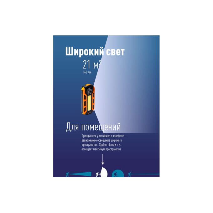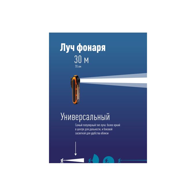 Источник света: 5 Вт COB LED (широкий свет); 1 Вт LED (луч), с коллиматорной линзой - позволяет создать поток света нужной направленности без снижения интенсивности. Световой поток: 160 лм. (широкий свет)/70 лм. (луч); Дистанция освещения: 21 м2 (широкий свет)/30 м (луч).