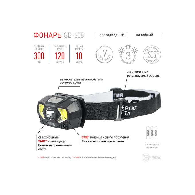 Налобный светодиодный фонарь ЭРА GB608 на батарейках, 3xAAA, 5Вт, 7 режимов, черный, Б0052319 оснащен современным SMD диодом и COB матрицей нового поколения. Фонарь может светить как в режиме направленного света, так и в режиме заполняющего света в рекордных 7 режимах свечения! Время работы от батареек ААА составляет 10 часов.