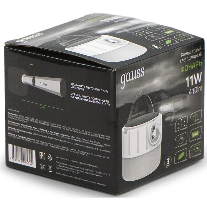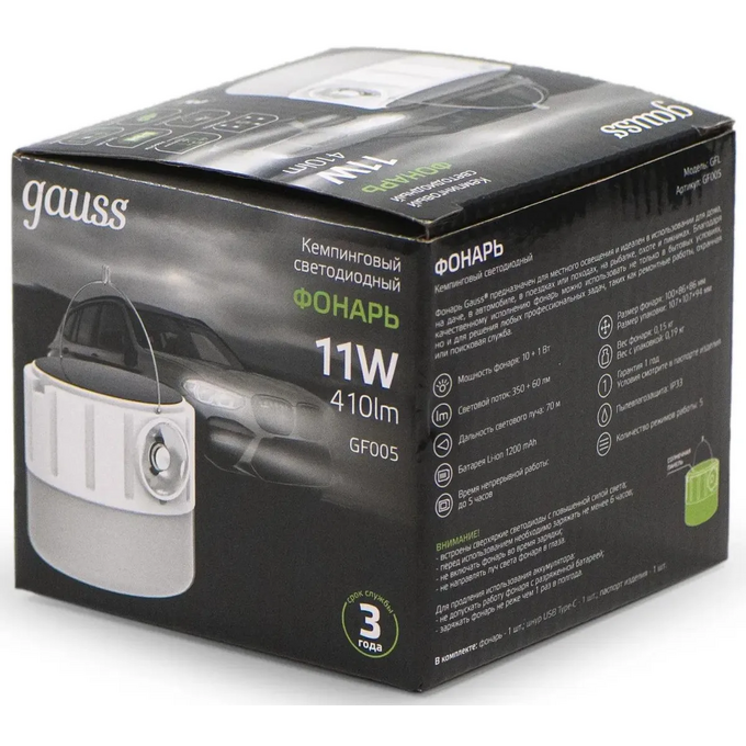 Фонарь походный Gauss GFL005 белый 11Вт лам.:светодиод. 312lx встроенный аккумулятор солн.бат. (GF005)