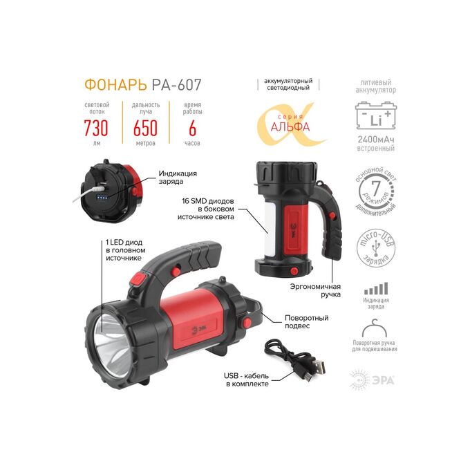 Фонарь отличается приятным дизайном и комфортом в использовании. В комплекте microUSB-кабель для подзарядки, имеется индикатор уровня заряда. При полном заряде работает непрерывно 6 часов. Благодаря емкому литиевому аккумулятору (2400 мАч) фонарь долго светит и мало весит. Удобно брать с собой, переносить, подвешивать и устанавливать на поверхность в качестве светильника. Идеальный вариант для кемпинга! Многофункциональность ЭРА PA-607 обеспечивается 7 режимами работы: основной свет, 100% яркости; основной свет, 50% яркости; мигание; боковой свет; боковой свет 50% яркости; боковой свет красный; боковой свет красный мигание.. Эргономичная ручка и поворотный подвес.
