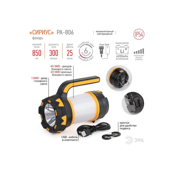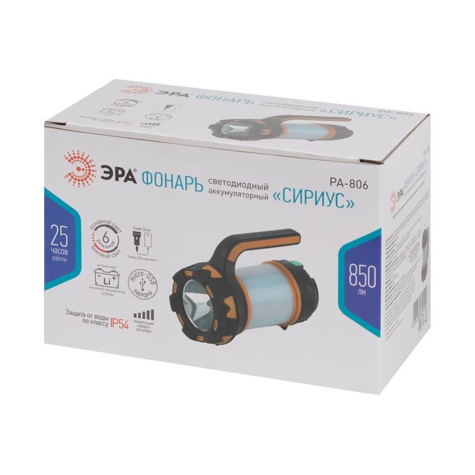 Аккумуляторный светодиодный фонарь ЭРА PA-806 прожектор Сириус, Б0054141 - эргономичный светодиодный фонарь-прожектор, работающий от аккумулятора. Удобно подзаряжается от USB при помощи кабеля, поставляемого в комплекте. Емкий литиевый аккумулятор 4200 мАч отлично держит заряд - 25 часов непрерывного свечения от одной подзарядки.