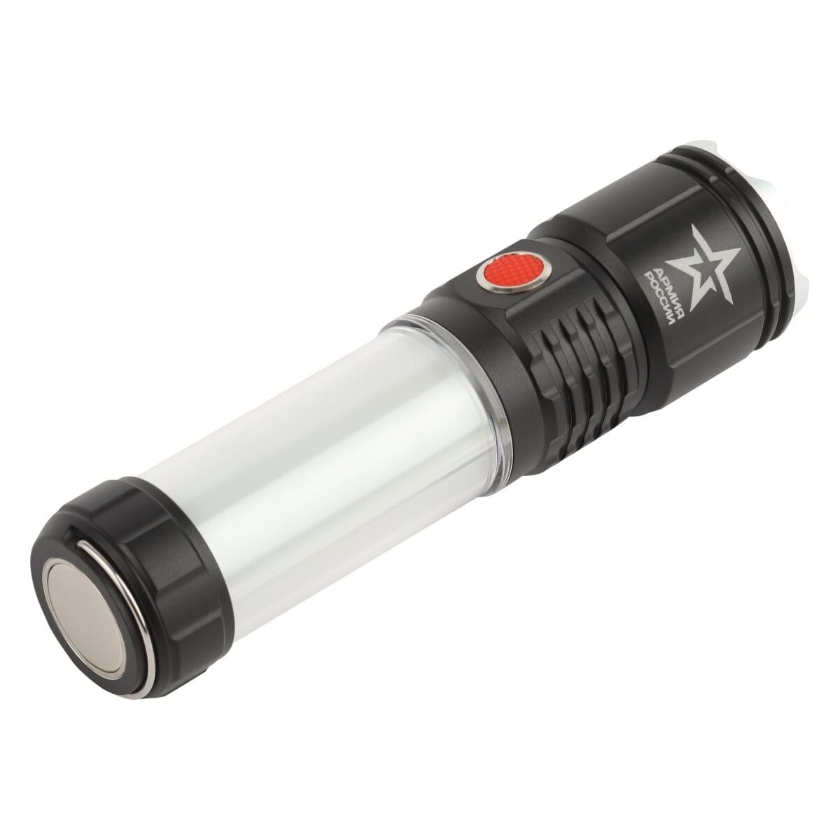 Армия России Тайфун выглядит отлично. Благодаря необычному фактурному дизайну корпуса и тщательной сборке его приятно держать в руках, а за счет продуманного функционала им приятно пользоваться. Фонарь украшает фирменная звезда Армии России - знак качества и особого статуса бренда. Аккуратная красная кнопка включения - дополнительный дизайнерский бонус.