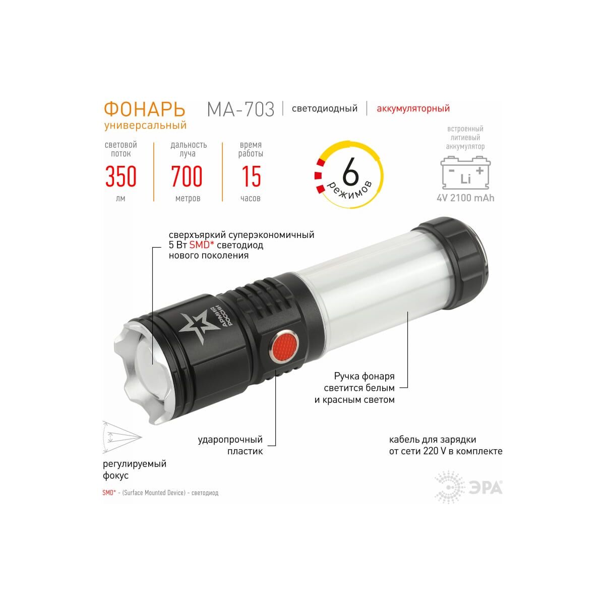 Светодиодный ручной аккумуляторный фонарь ЭРА АРМИЯ РОССИИ MA-703 Тайфун 10Вт 6 режимов Li аккумулятор магнит крючок Б0052320 - универсальный светодиодный аккумуляторный фонарь с лучом повышенной дальности, пятикратным зумом и встроенным светонакопителем. Его легко найти в темном помещении или в траве - после выключения сохраняет небольшое свечение.