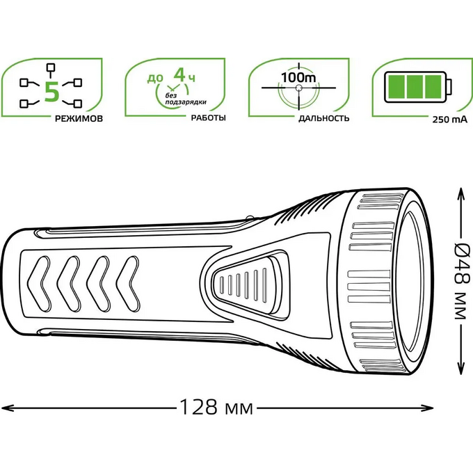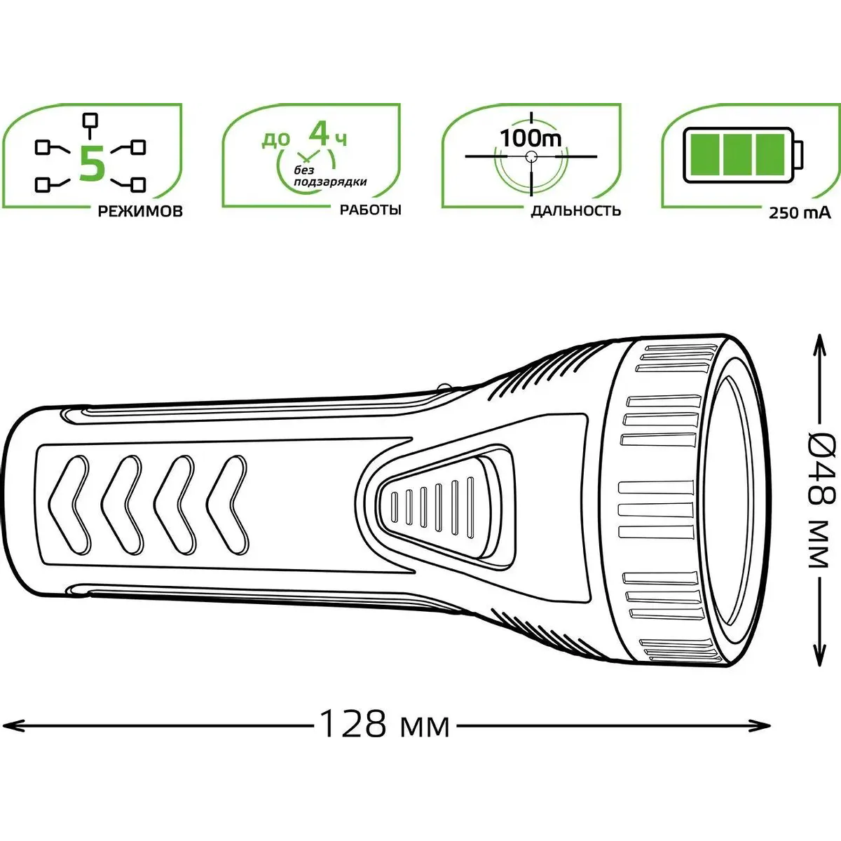 Установлен яркий современный светодиод, снабженный качественным светоотражателем. 2 режима работы фонаря: - максимальная мощность, - приглушенный свет.