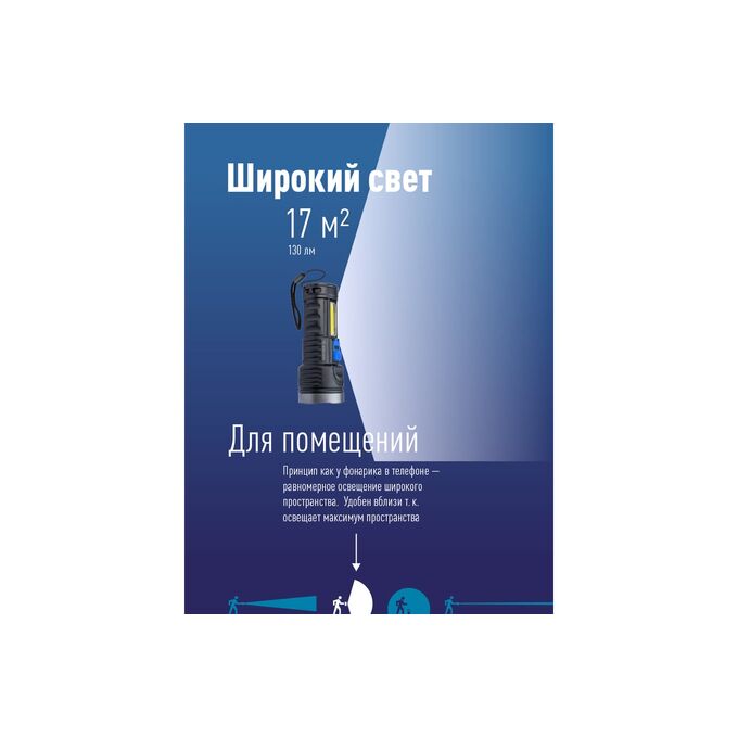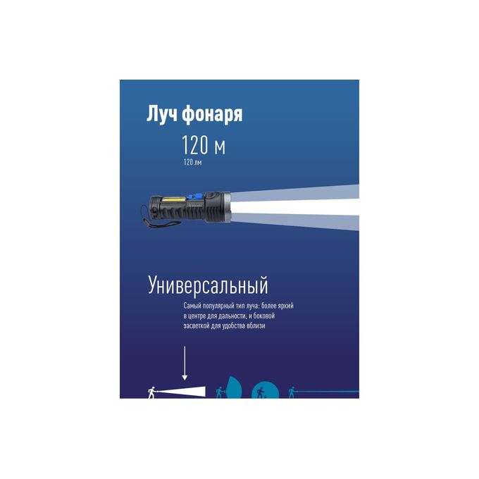 6.Дистанция освещения: 120 м. (луч)/17м2 (широкий свет, боковой светильник).
