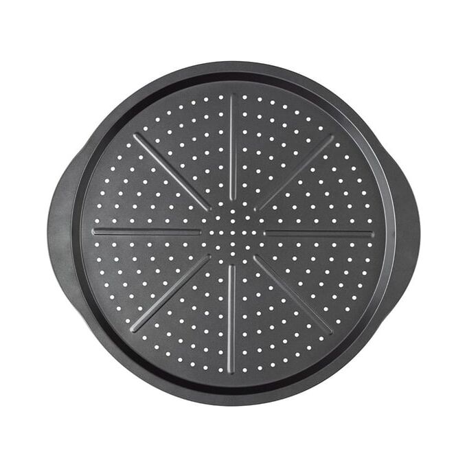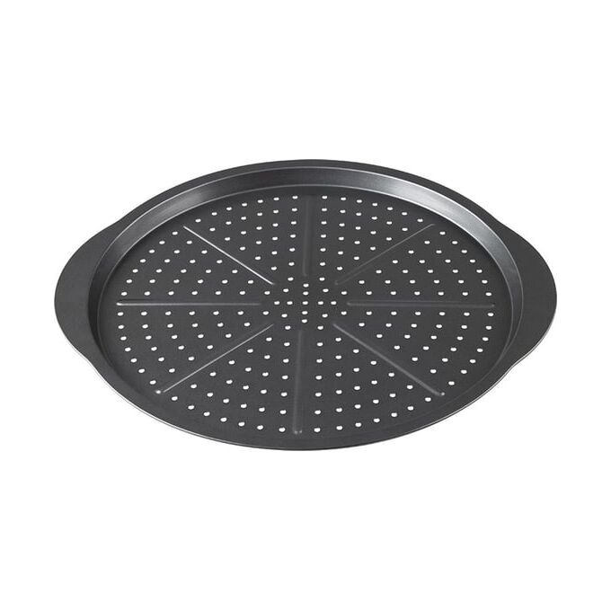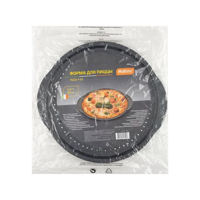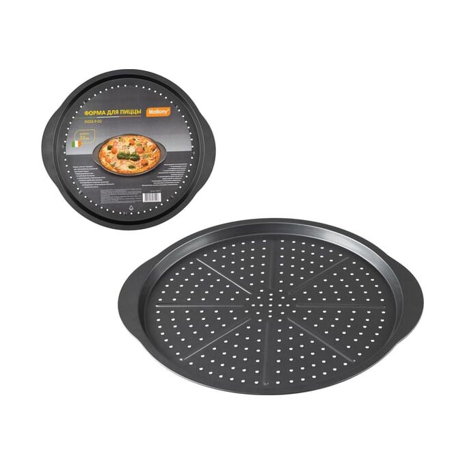 Форма для пиццы Mallony PIZZA P-02 диаметр 33 см для удобства использования снабжена ручками. Перфорированное дно обеспечивает более быстрое и равномерное пропекания теста. Антипригарное покрытие исключает необходимость использования большого количества масла.