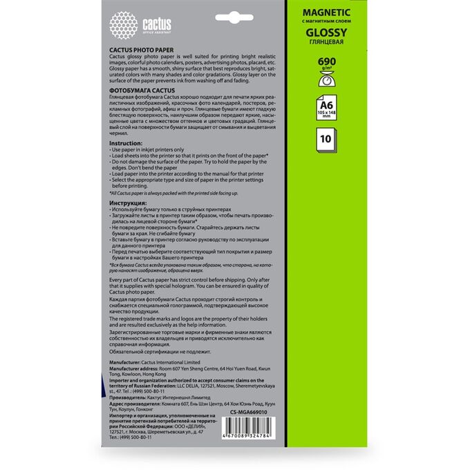 Фотобумага CACTUS CS-MGA669010 A6/690 г/м2, 10 листов, белый глянцевое/магнитный слой для струйной печати 1033436 предназначена для распечатки бизнес-графики, презентаций, флаеров и фотографий.