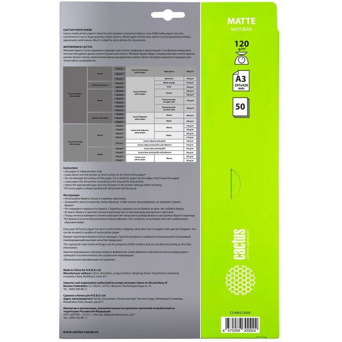 Фотобумага Cactus Photo Paper (CS-MA312050) A3 120 г/м² 50 листов