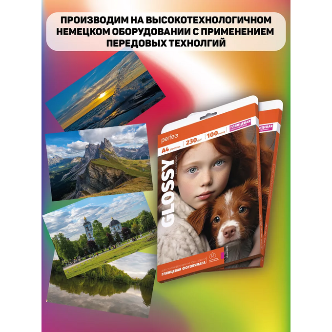 Высококачественная премиум (premium) глянцевая (glossy) фотобумага A4 (стандартный альбомный лист) производится на немецком оборудовании с использованием последних, передовых технологий в обработке и производстве фотобумаги. Фотобумага Perfeo формата А4 в упаковке по 100 шт. плотностью 230 гр/м2, предназначена для бизнес процессов фотолабораторий и фото студий. Идеально подходит для создания различных изображений, фотографий, рекламных материалов, брошюр и документов. Матовое покрытие из специального полимерного верхнего слоя, обеспечивает яркие, насыщенные цвета, защищает от влажности и света, предотвращает от растекания краски при печати. Высокая плотность бумаги позволяет создавать отпечатки профессионального качества, а также, благодаря своему особому составу обеспечивает высокое разрешение и детализацию изображений с максимальным разрешением до 5760 DPI (точек на дюйм). Предназначена для печати на любых струйных принтерах таких производителей как EPSON, HP, Canon, Lexmark, Brother, Xiaomi. Так же бумага обладает очень важной характеристикой для струйной печати - быстрая впитываемость и высыхание чернил. При печати на нашей бумаге Вы получите насыщенный и глубокий чёрный цвет. Идеальна для чернил на водной и пигментной основе. Бумага 230 гр/м2 относится к плотной бумаге, подходит для печати фотографий и визиток.