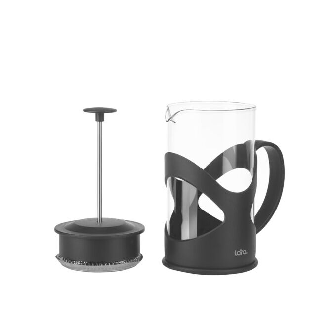 Практичный и стильный дизайн френч-пресса Lara LR06-56 порадует за чаепитием не только вас, но и ваших гостей. Френч-пресс выполнен из экологически чистых материалов. Колба сделана из жаропрочного боросиликатного стекла абсолютно безопасного для пищевых продуктов. Она заключена в стильный черный корпус и имеет ручку, за которую удобно держать френч-пресс. Оригинальный внешний вид изделия украсит интерьер современной кухни. Форма носика идеальна для наливания напитков и препятствует образованию подтеков. Пресс-фильтр из нержавеющей стали с уплотнительным кольцом. Благодаря прозрачным стенкам вы сможете определить крепость заваренного напитка. Кроме того, данная модель оснащена ненагревающейся ручкой, что обеспечивает удобство и безопасность использования. Модель представлена в нескольких объемах: 350, 600, 800, 1000 мл. Френч-пресс упакован в подарочную коробку.