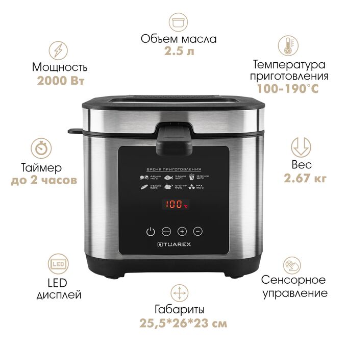Регулировка температуры приготовления, Сенсорное управление, LED дисплей, Таймер до 2 часов, Корзина для фритюра с ручкой, Антипригарное покрытие чаши, Защита от перегрева, Съемная крышка, Прозрачное окошко на крышке, Индикатор работы