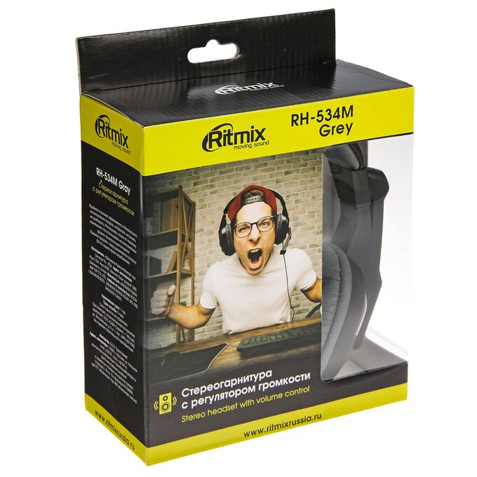 Гарнитура Ritmix RH-534M Gray мониторный тип O40 мм, микрофон, регулятор громкости, кабель: 2,4 м