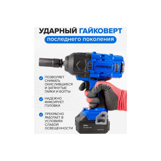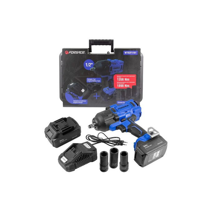 Гайковерт Forsage F-WT02F1161(51694) ударный 1/2"+набор головок ударных глуб.17,19,21мм 2 АКБ+ЗУ, 20V, 5.0AH LI-ION, 1550об/мин