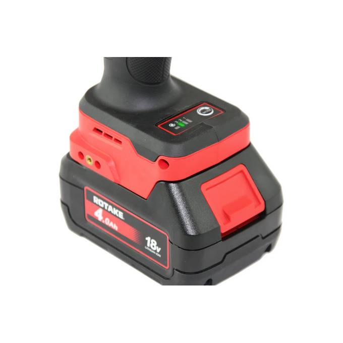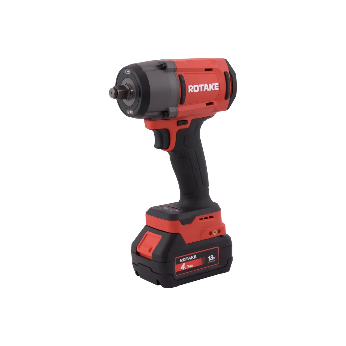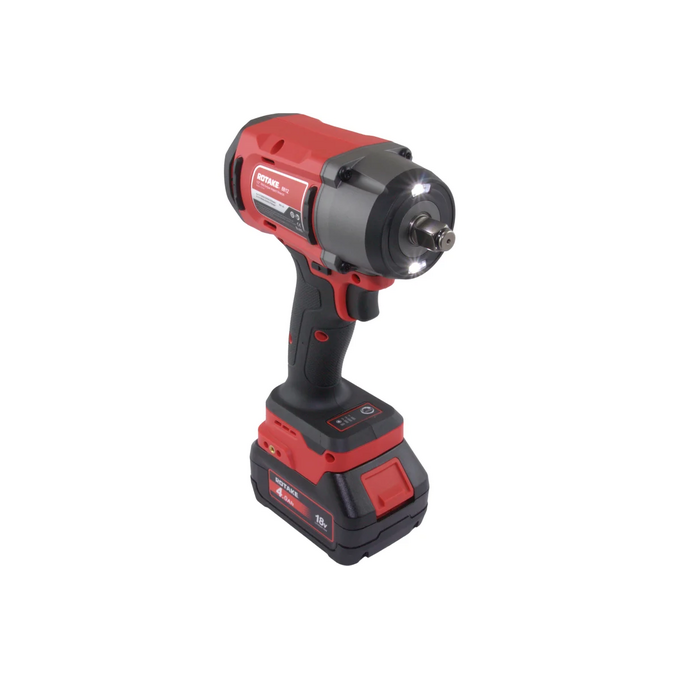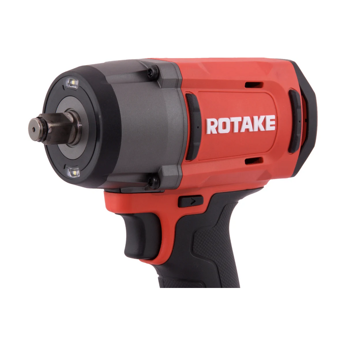 Гайковерт ударный аккумуляторный 1/2"DR ROTAKE. Инструмент оснащен двойной светодиодной подсветкой для оптимального освещения рабочей зоны, блоком управления режимами и автостопом со световой индикацией. Ударопрочный корпус с резино-полимерными вставками обеспечивает защиту от повреждений, а эргономичная противоскользящая рукоятка гарантирует удобство и надежность в использовании.