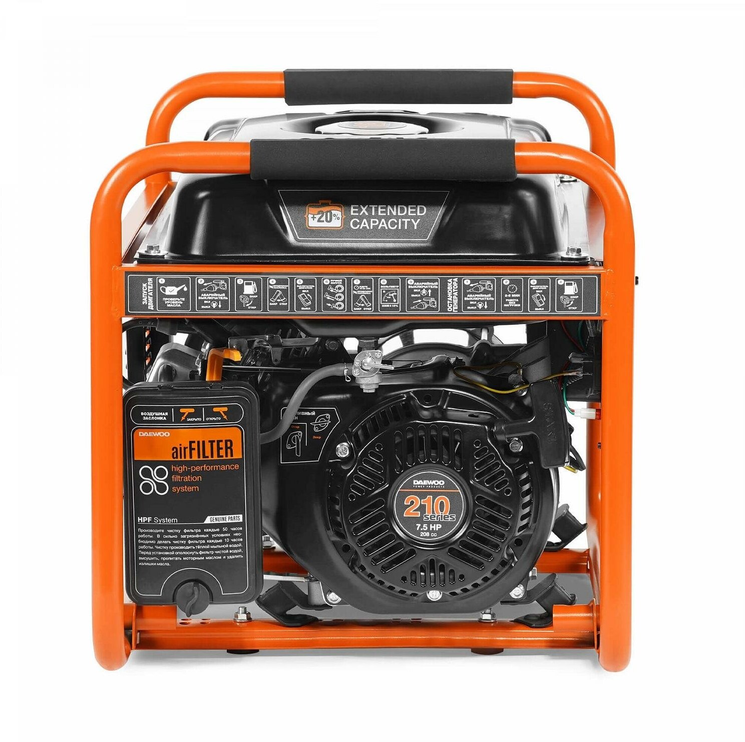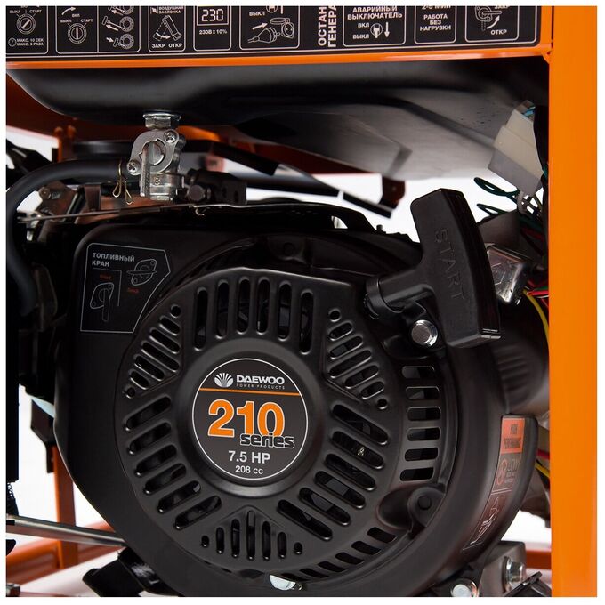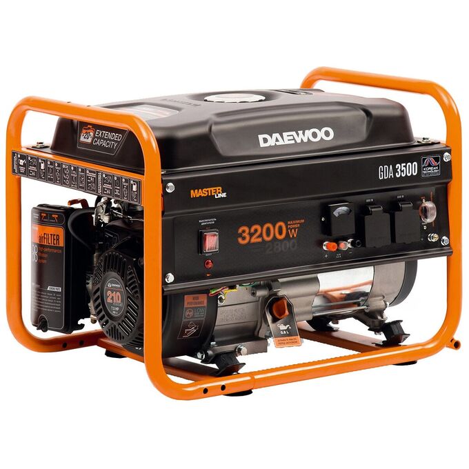 Электрогенератор Daewoo GDA 3500 обладает оптимизированной конструкцией, что позволило производителю увеличить мощность четырехтактного двигателя до 7.5 Вт. Это положительным образом сказывается и на работе аппарата, его экономичности даже при максимальных нагрузках. Для работы агрегата используется бензин. Мощность генератора при подключении к сети 220 В соответствует 2.8 кВт.