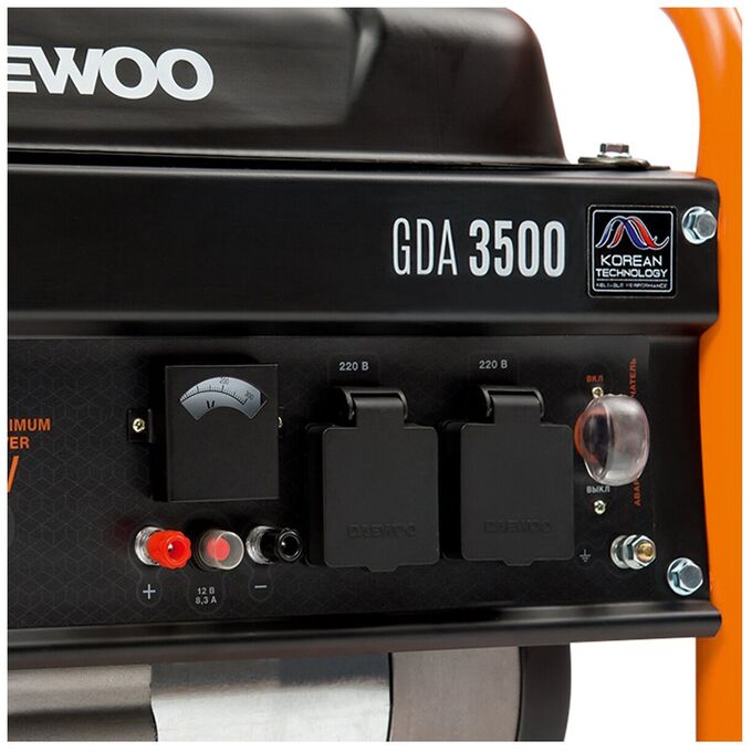 Daewoo GDA 3500 задействует в работе стабилизацию напряжения AVR. Корпус прибора содержит две розетки 220В/16А. Оборудование с емкостью топливного бака 18 л предусматривает ручной запуск. Во включенном состоянии уровень шума электрогенератора соответствует 69 дБ.Он весит 37 кг и содержит выступающие элементы, обеспечивающие комфортную транспортировку аппарата.