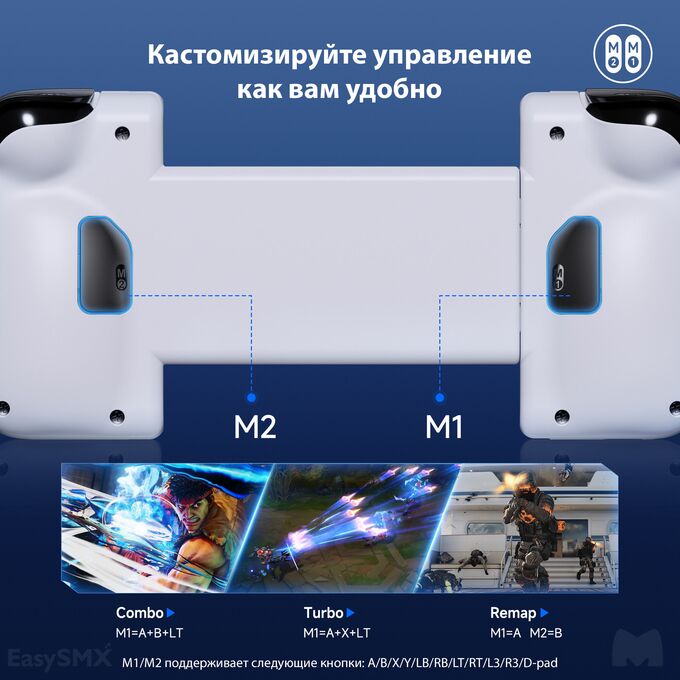 Геймпад M05 оснащен 2 расширяемыми клавишами, которые можно сопоставлять и программировать. Это позволяет настраивать функции клавиш в соответствии с вашими предпочтениями и игровыми потребностями, позволяя выполнять такие действия, как комбинации в одно касание и специальные приемы, для достижения побед в игре без особых усилий.