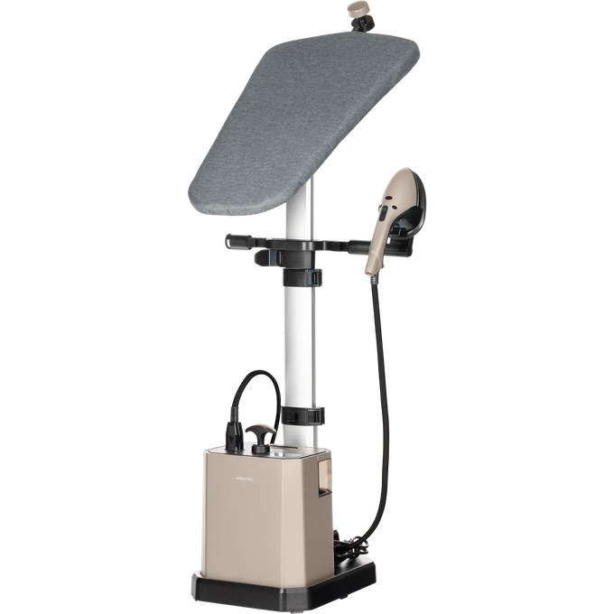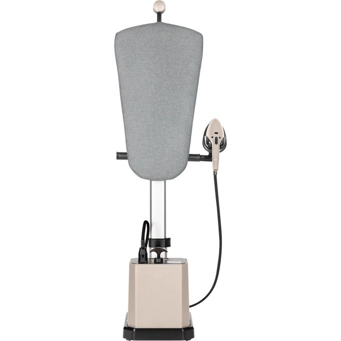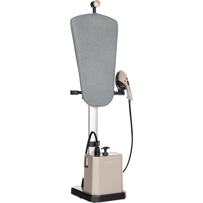 Компактная конструкция цвета слоновой кости украсит любую гардеробную и не займет много места в сложенном состоянии. Рабочая поверхность доски с мягким тканевым чехлом регулируется в четыре положения: горизонтально, вертикально, под углом 30° и 60°, что позволяет адаптировать систему под разные типы одежды и сценарии использования — от глажки рубашек и платьев на плечиках до вертикального отпаривания костюмов. Со съемным мобильным блоком на колесиках, резервуаром объемом 2.9 л и шлангом длиной 1,45 м легко отпаривать шторы, текстильные панели и другие объекты.