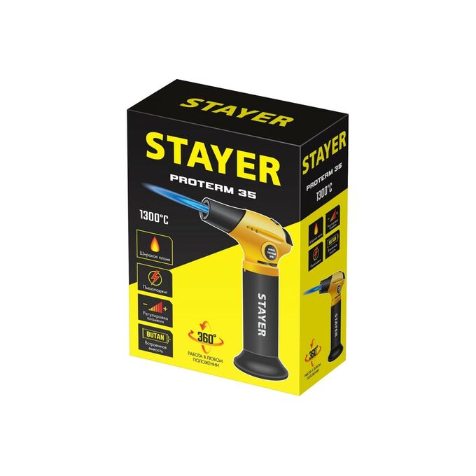 Автономная портативная газовая горелка STAYER ProTerm 35 с пьезоподжигом, 1300С 55522 выполнена из высококачественных материалов. Газовая горелка обладает возможностью выбора температурного режима. Идеально подходит для лужения, прогрева и многих других работ. Работает на жидком газе - бутан.