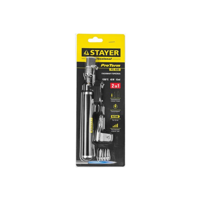 Газовая горелка , 2в1, пьезоподжиг, 4 насадки, 1200С STAYER 55505-H6& отличается высокой надежностью и безопасностью в эксплуатации.