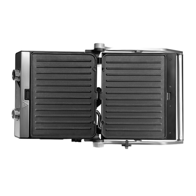 Гриль можно полностью раскрыть на 180°, что удобно для приготовления на большой поверхности, а регулируемая крышка адаптируется к толщине продуктов, обеспечивая равномерное прожаривание.