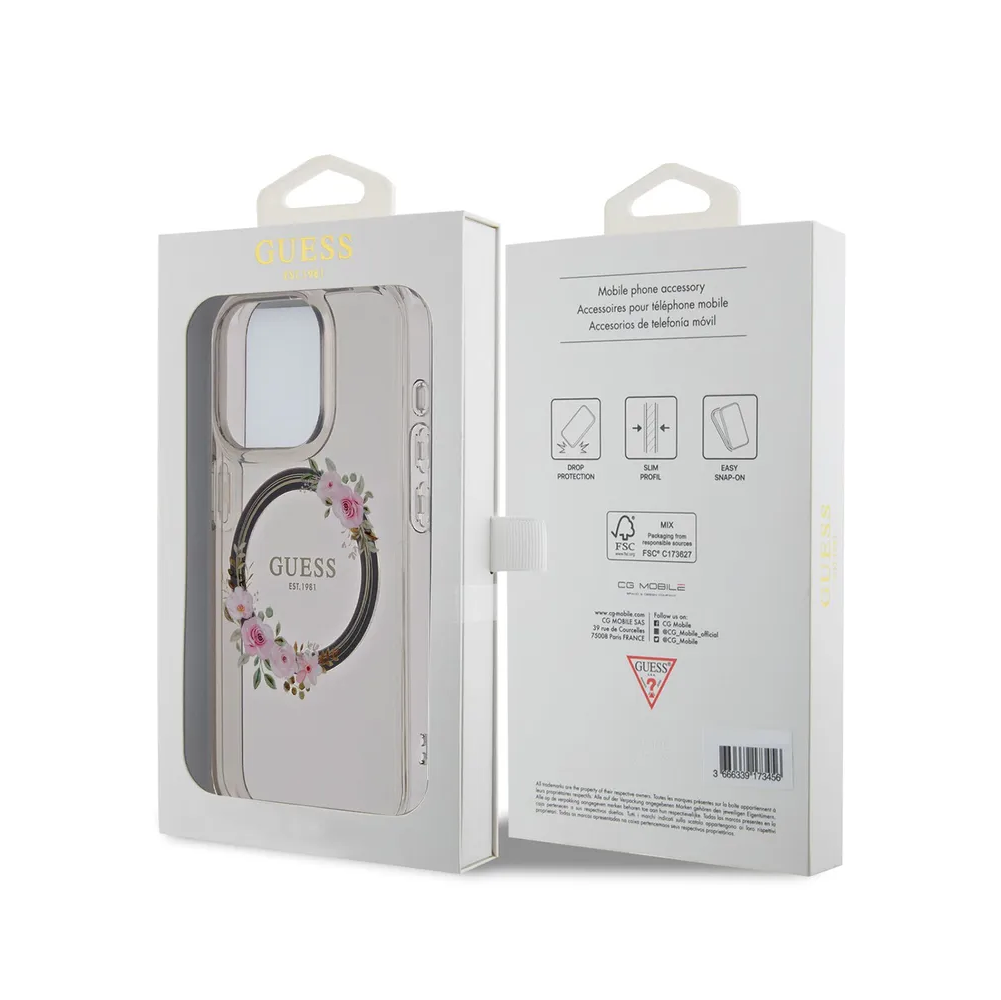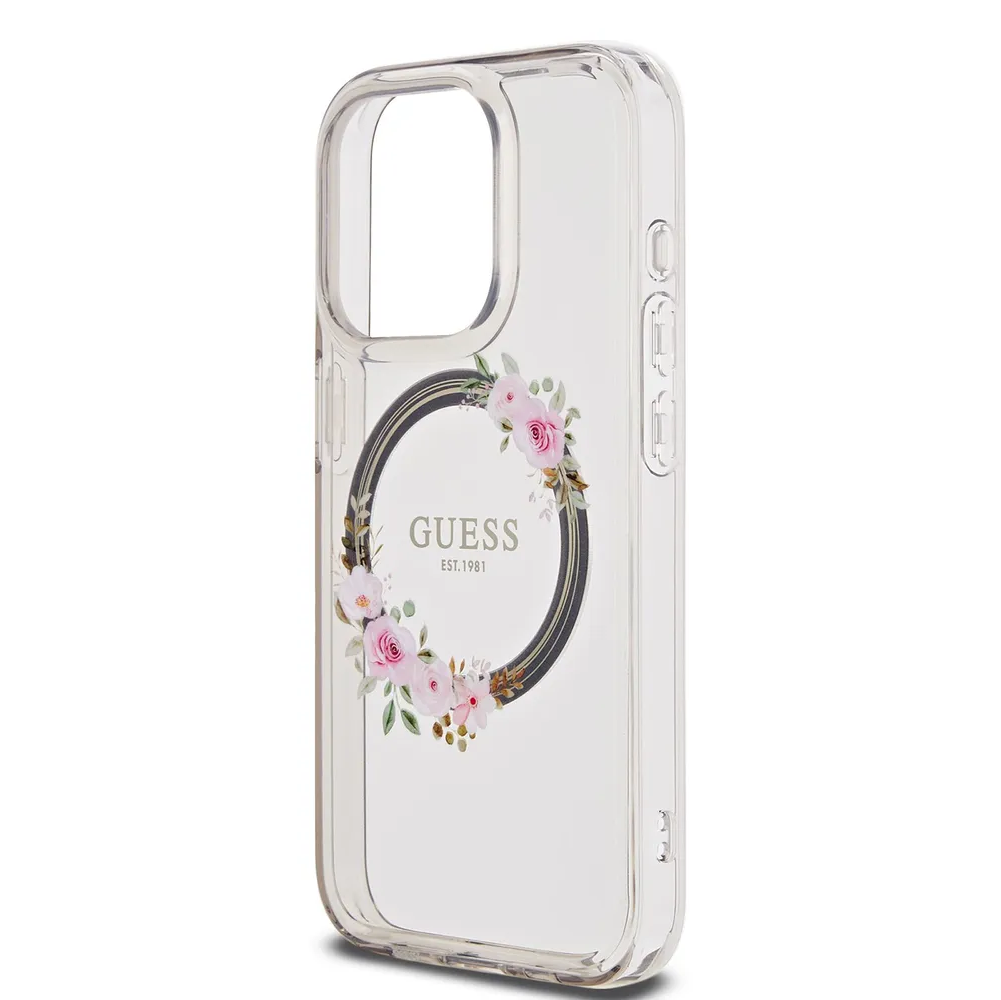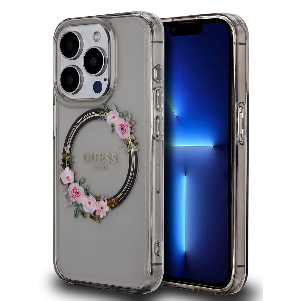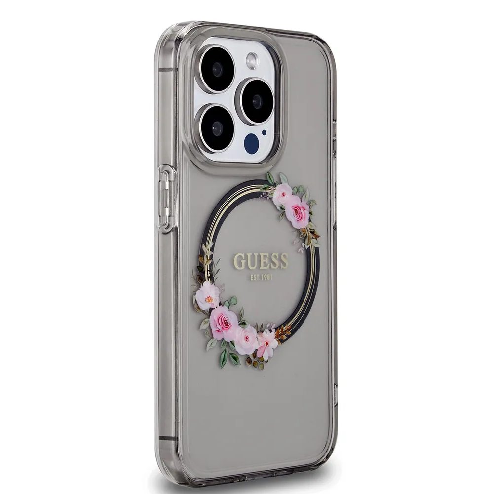 Guess для iPhone 15 Pro чехол PC/TPU Flowers Wreath Hard Black (MagSafe)