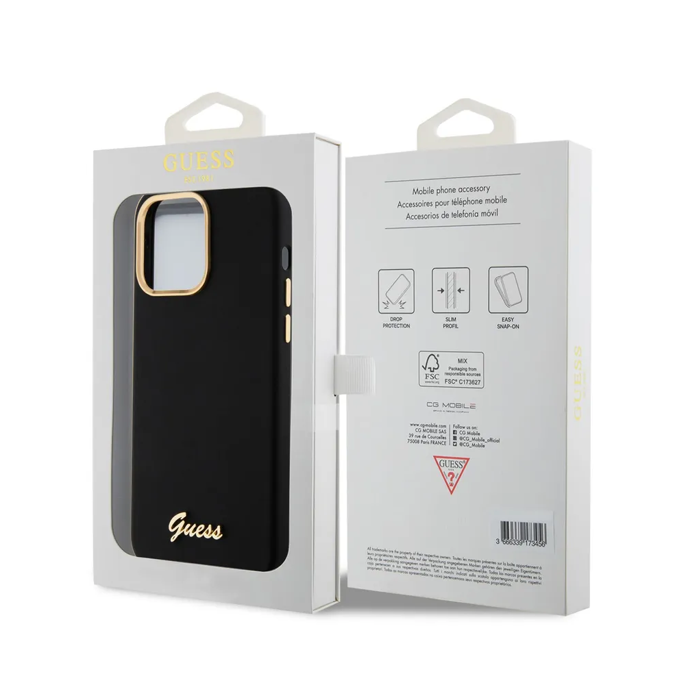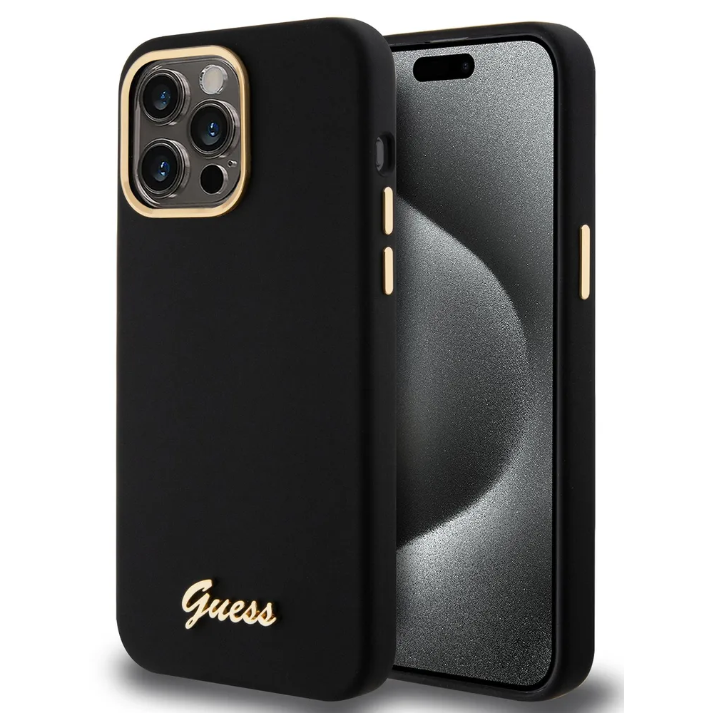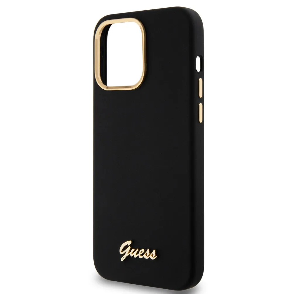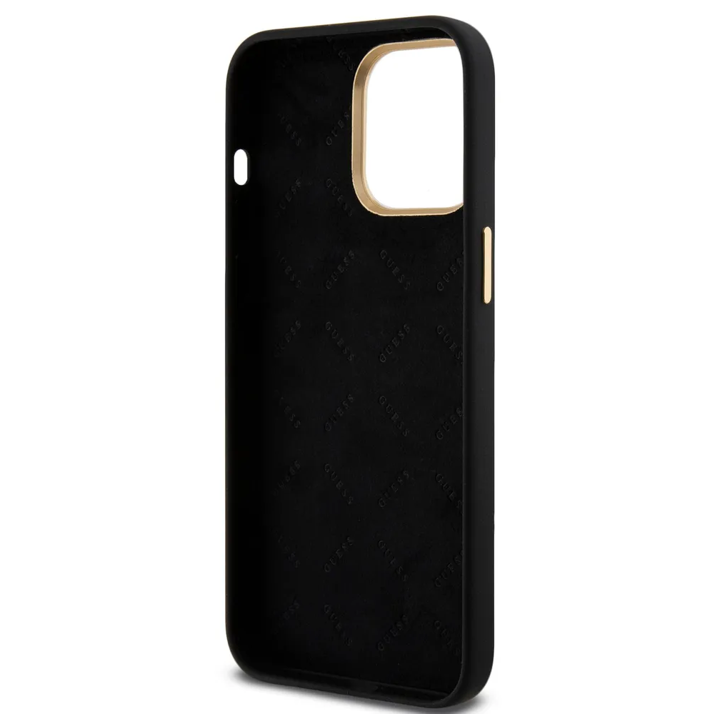 Guess для iPhone 15 Pro Max чехол Liquid silicone Gold metal logo & Camera frame Hard Black