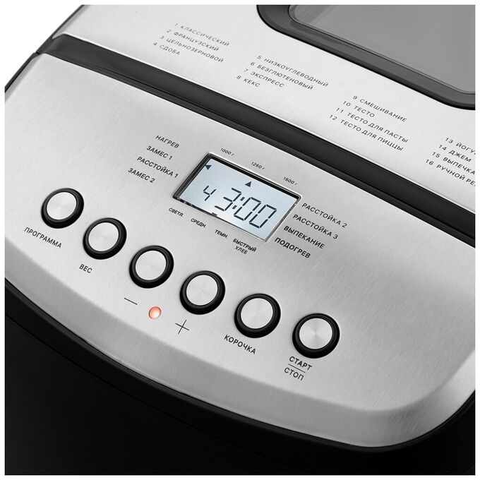 выбор цвета корочки, таймер, регулировка веса выпечки, пользовательский режим, поддержание температуры