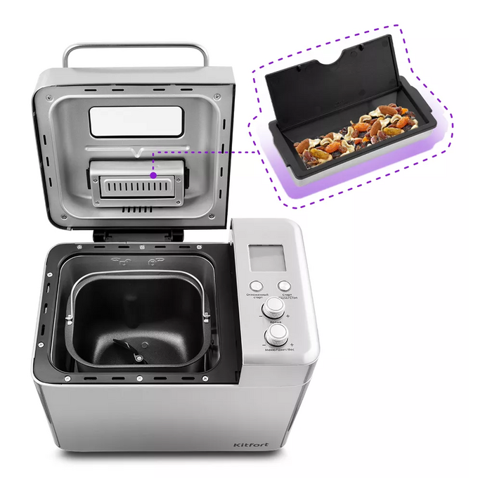 В крышку установлен автоматический дозатор для добавления в выпечку дополнительных ингредиентов во время приготовления без вашего участия! Кунжут, орехи, зелень, изюм, цукаты – всё и даже больше на ваш вкус