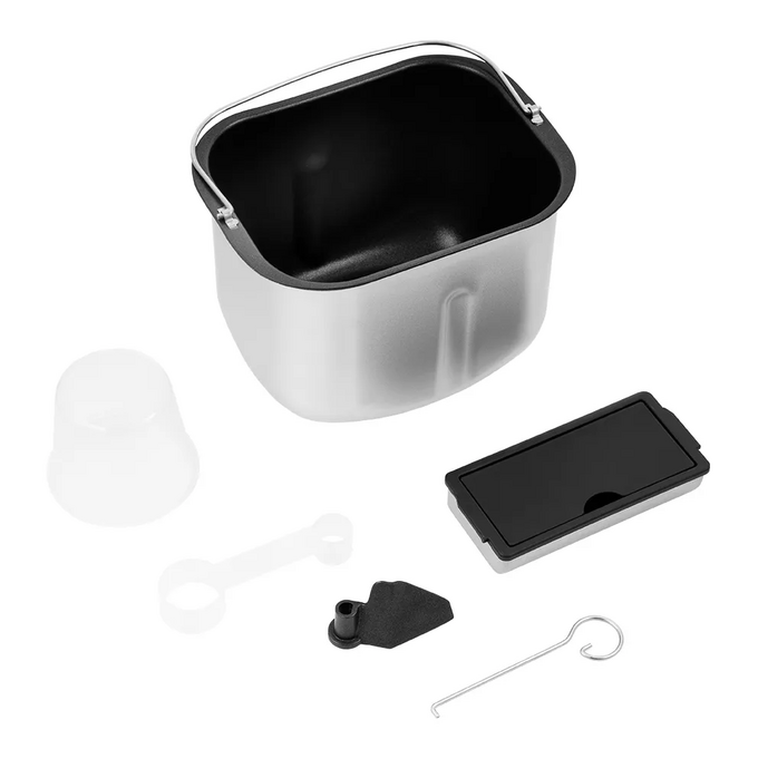 В комплекте есть уже всё необходимое, чтобы начать творить домашнюю выпечку или десерты: мерный стакан и мерная ложка, крюк для извлечения лопатки, а также рецепты - от классического до безглютенового хлеба