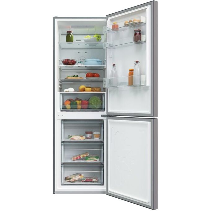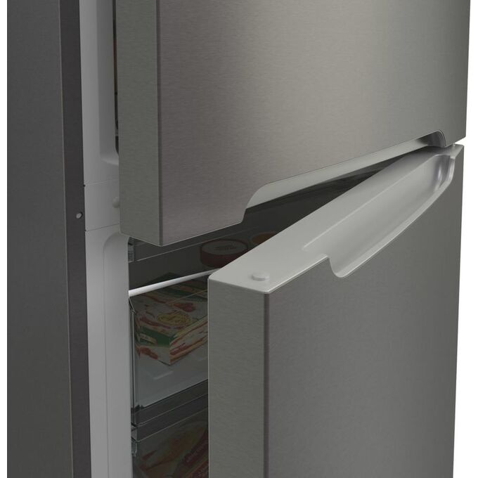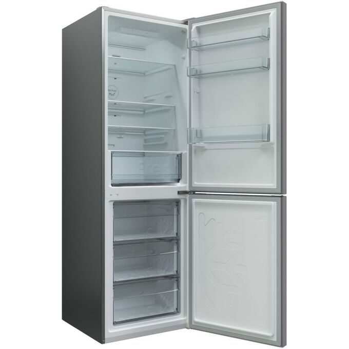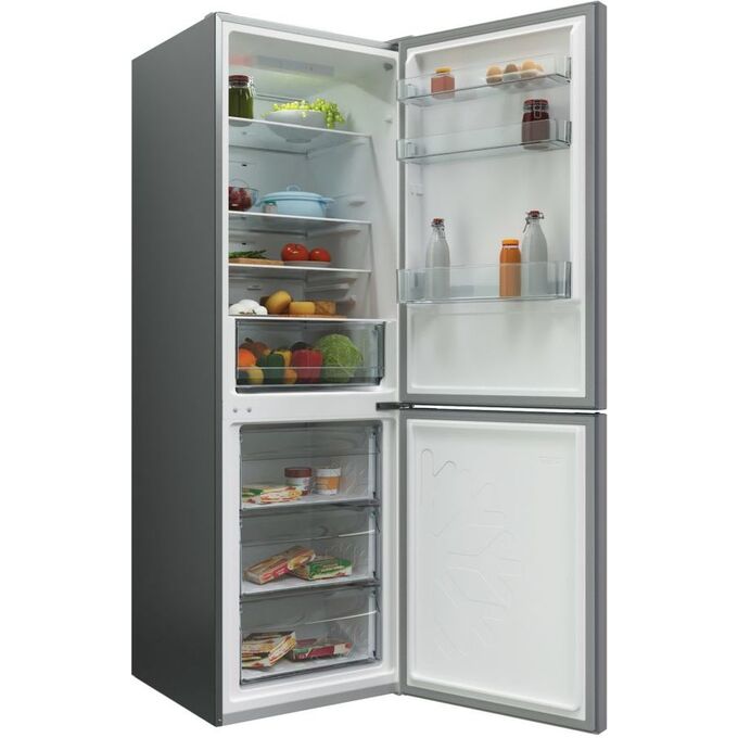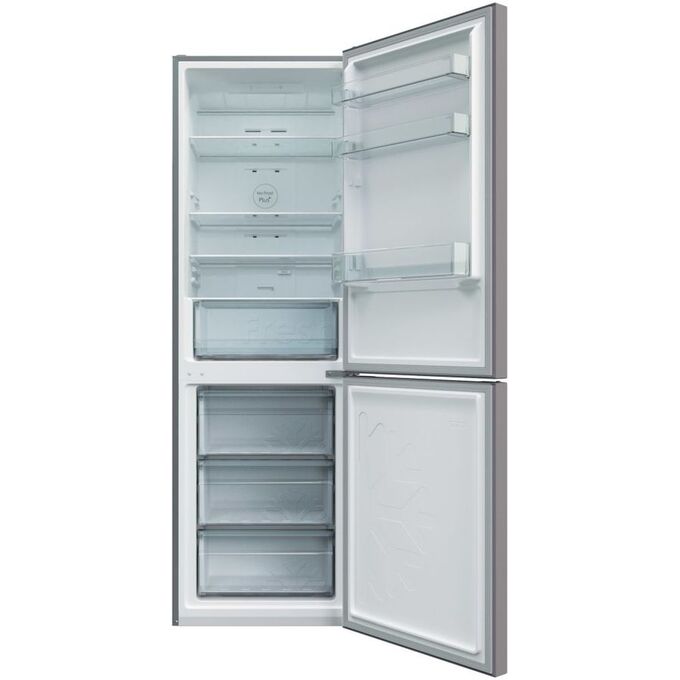 количество камер: двухкамерный; расположение морозильной камеры- снизу, размораживание морозильной камеры- No Frost, общий объем 370л, цвет: серебристый