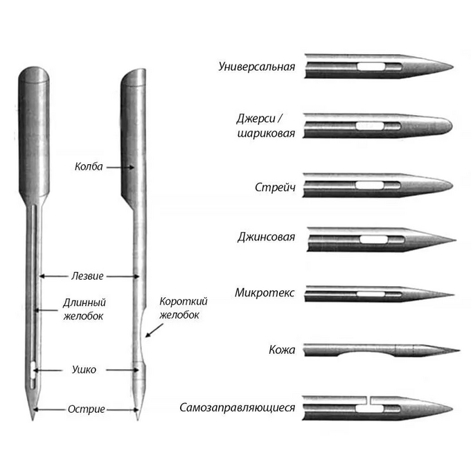 стандартные № 70, 80, 90 – для легких х/б и костюмных тканей.