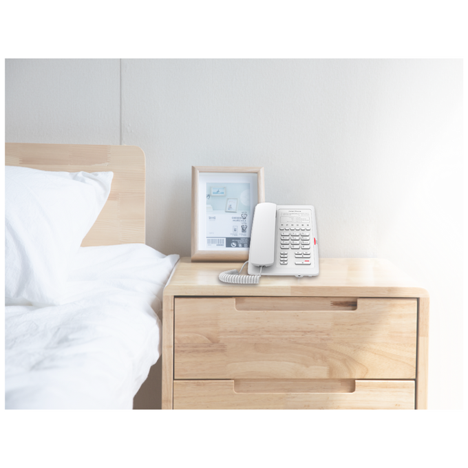 Лицевая панель может изменяться в соответствии с требованиями отеля. Имеет три режима работы: телефонная трубка/спикерфон/гарнитура.