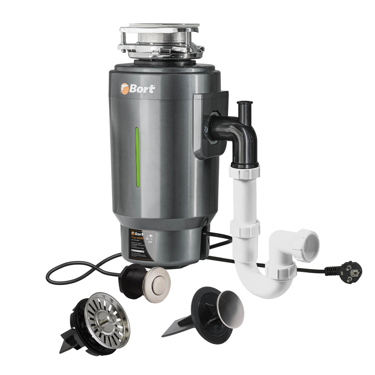 Измельчитель пищевых отходов Bort Titan 6000 Мощность л.с. 0,75, 600Вт, 5,2кг/мин, 4000об/мин, 1400мл, Металл, набор аксессуаров 8шт