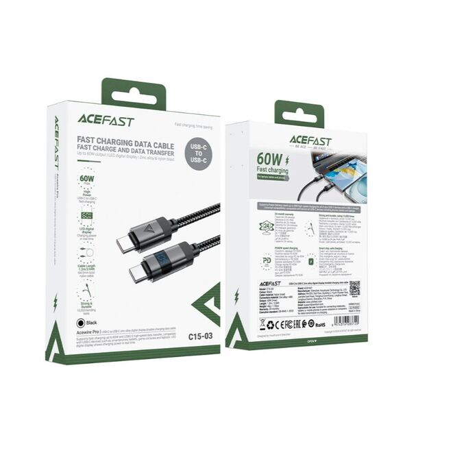 Дата-кабель ACEFAST C15-03 USB-C To USB-C Zinc Alloy Digital Display Braided Charging Data Cable. черный