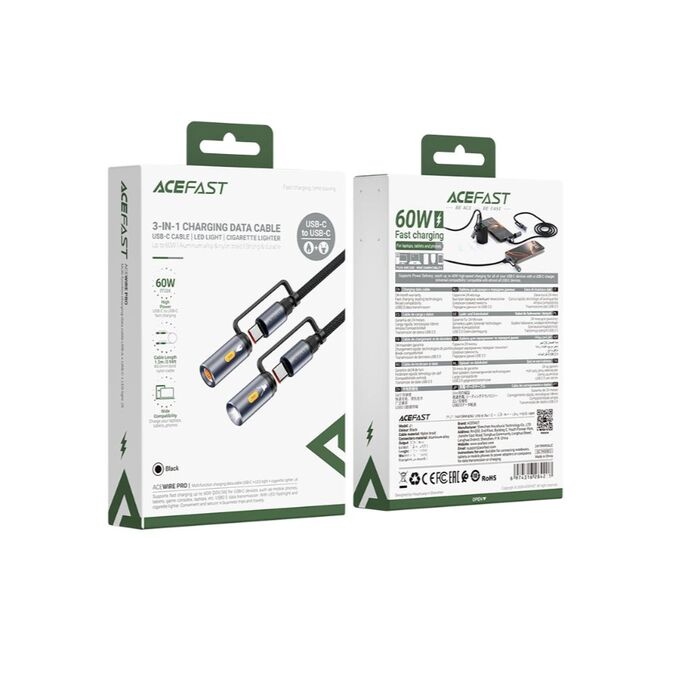 Дата-кабель ACEFAST AF-J4-BK Multi-Function Charging Data Cable USB-C+ Led Light + Cigarette Lighter Black