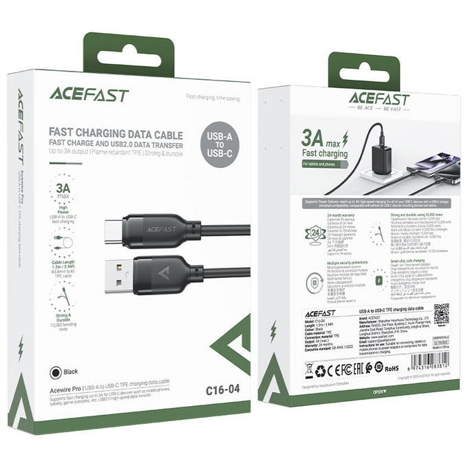 Кабель AceFast C16-04 USB-A to USB-C TPE charging data, Black