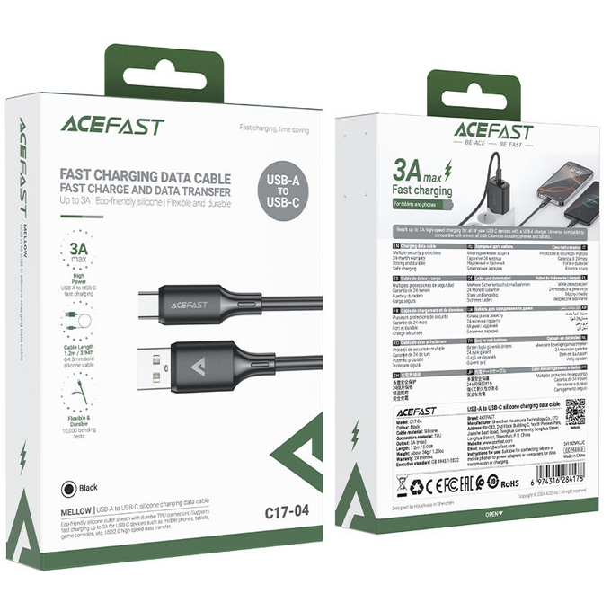 Кабель AceFast C17-04 USB-A to USB-C silicone charging data cable, Black