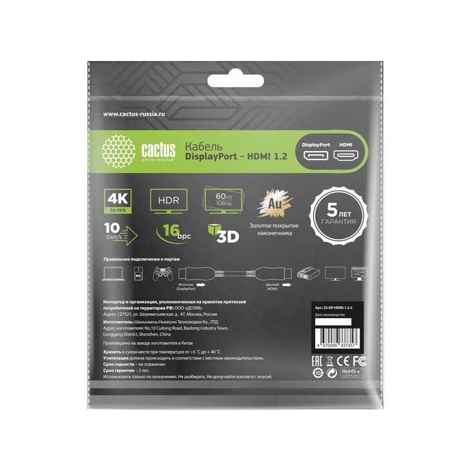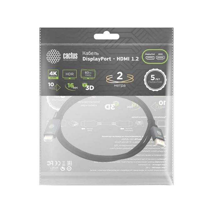 Кабель аудио-видео Cactus CS-DP-HDMI-1.2-2 DisplayPort(m)/HDMI(m) 2м позолоч.конт. черный