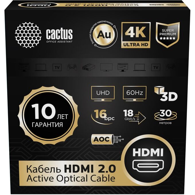 Оптический кабель HDMI 2.0 премиальной серии позволяет передавать высококачественные цифровые данные на большие расстояния БЕЗ помех и потери качества с компьютера, ТВ приставки и т.д. на телевизор, монитор или проектор.