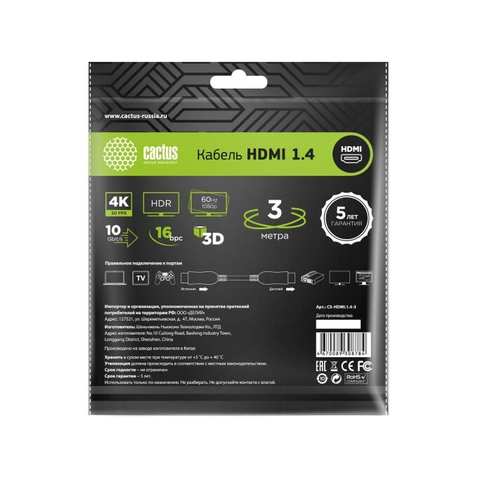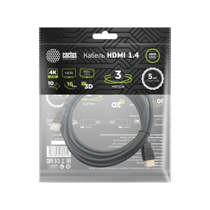 Кабель аудио-видео Cactus CS-HDMI.1.4-3 HDMI (m)/HDMI (m) 3м черный