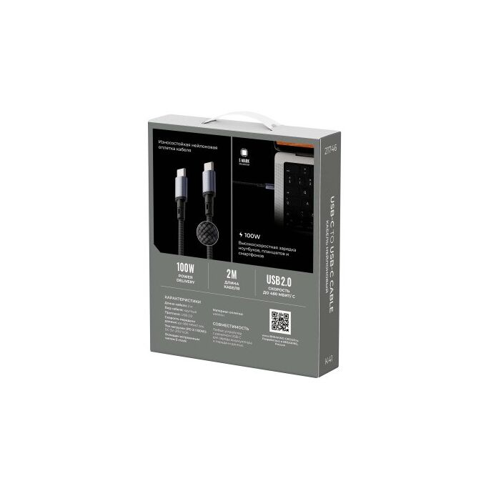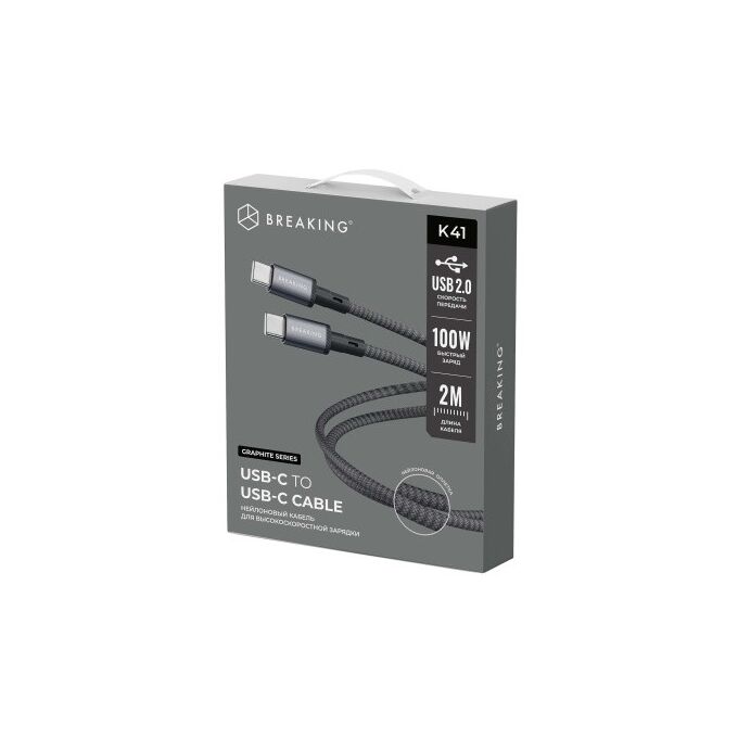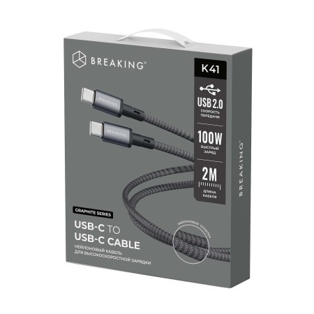 Кабель Breaking Graphite K41, USB-C - USB-C, 100W, 5.0A, 2м (Графит)