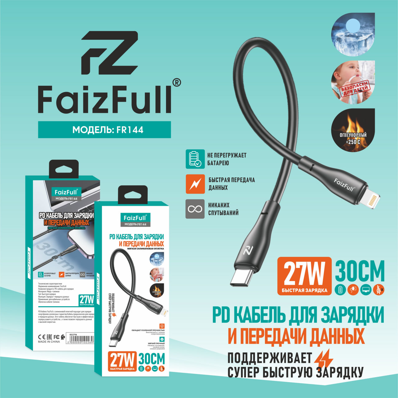 Кабель FaizFull FR144 Type-C to Lightning Silicone 30см Черный