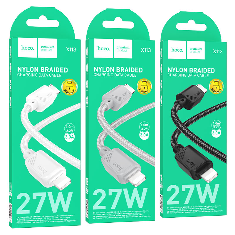 X113 Beneficio, Type-C на iP зарядный дата кабель, поддержка быстрой зарядки PD 27W, нейлоновая оплётка и коннекторы из PVC, длина – 1м