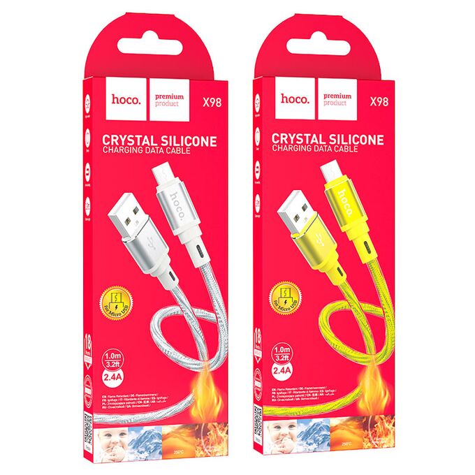 X98 Crystal ice, кабель для зарядки и передачи данных USB на Micro-USB, ток до 2.4A, силиконовая оплётка, длина – 1м
