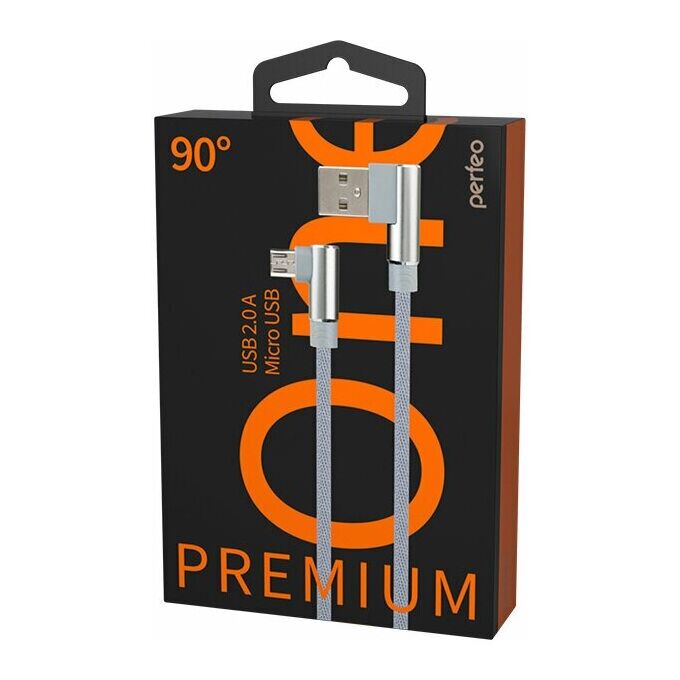 Кабель PERFEO U4805 USB2.0 A вилка - Micro USB вилка, угловой, серый, длина 1м, бокс