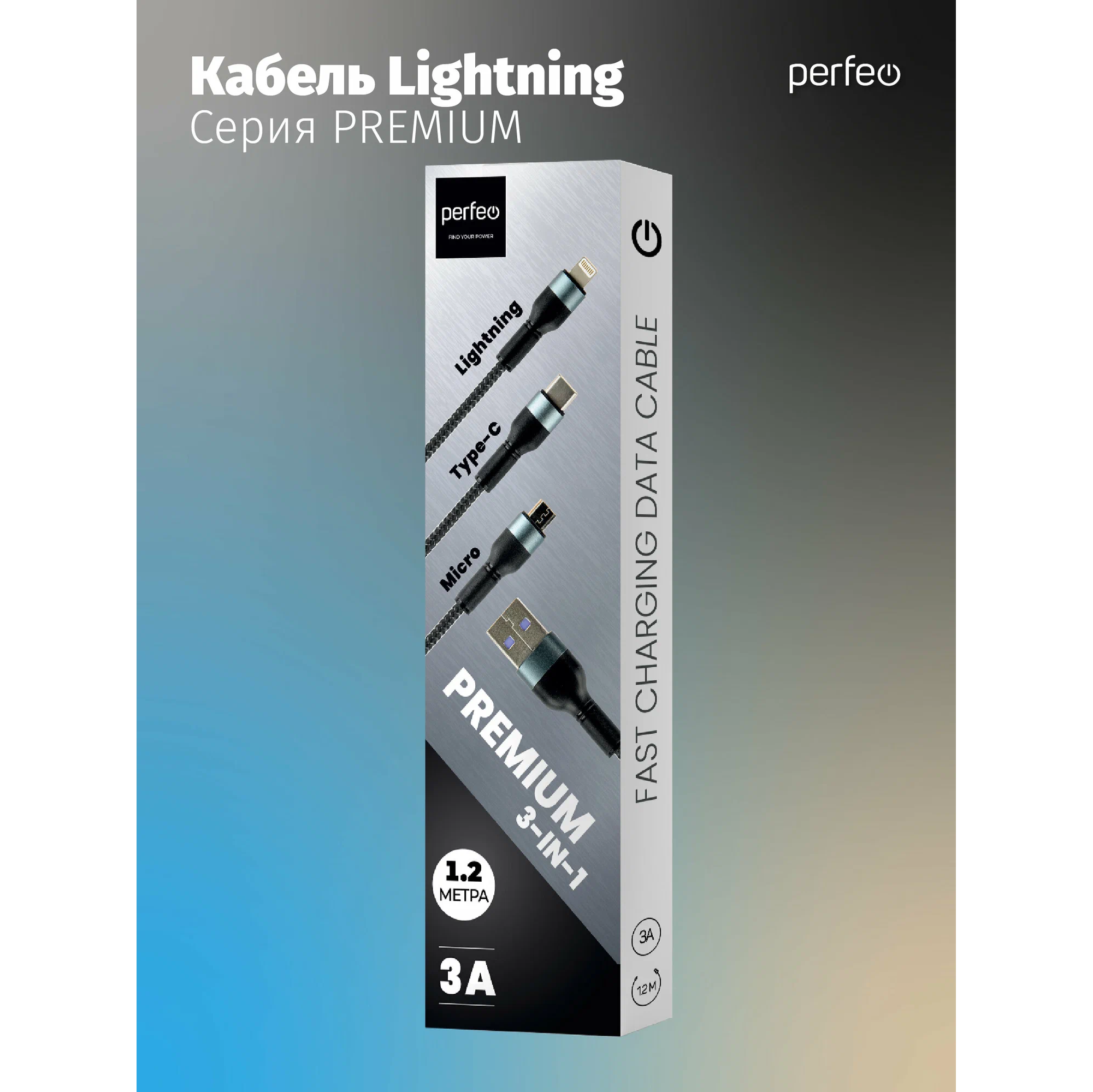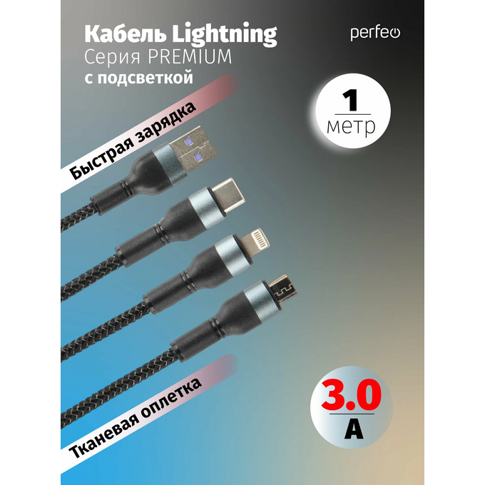 Кабель PERFEO USB A вилка - 3 в 1 (Micro+Type-C+8 PIN вилка), 3А, черный, длина 1,2 м., (U5002)